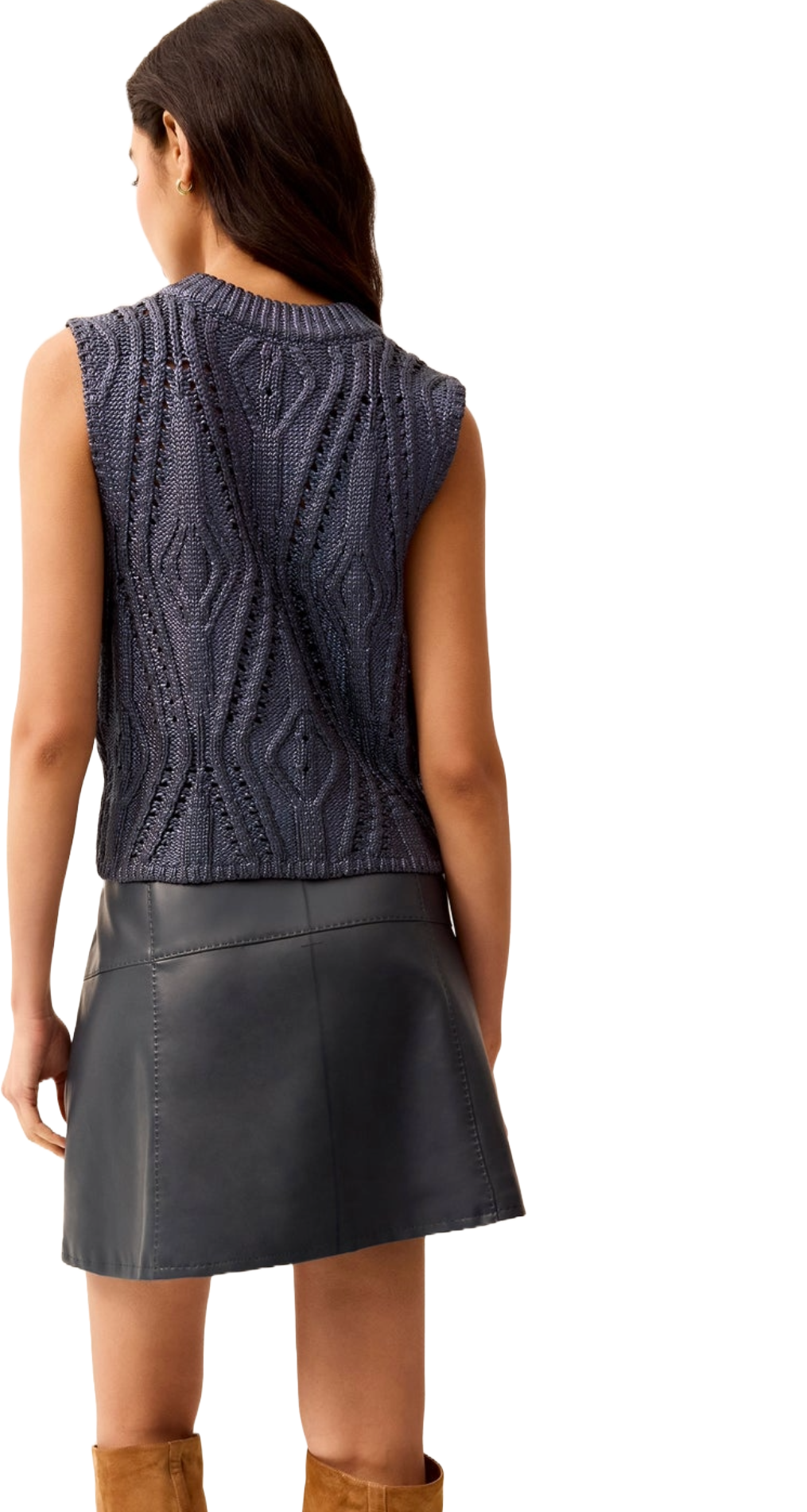 The perfect almost mini skirt? Say less. The naval color functions as a denim skirt, we thinks. This skirt is a vegan leather with rayon coating and has a zipper and clasp closure to go with it. We reccomend staying true to size as this runs fitted through the hips and waist and flares out at the bottom.